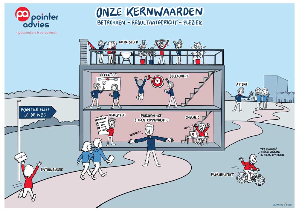 De praatplaten en tekeningen gebruik je in presentaties, teamoverleggen en interne communicatie, zodat mensen niet alleen weten wat de bedoeling is, maar ook voelen waarom het belangrijk is en hoe zij daaraan bijdragen.